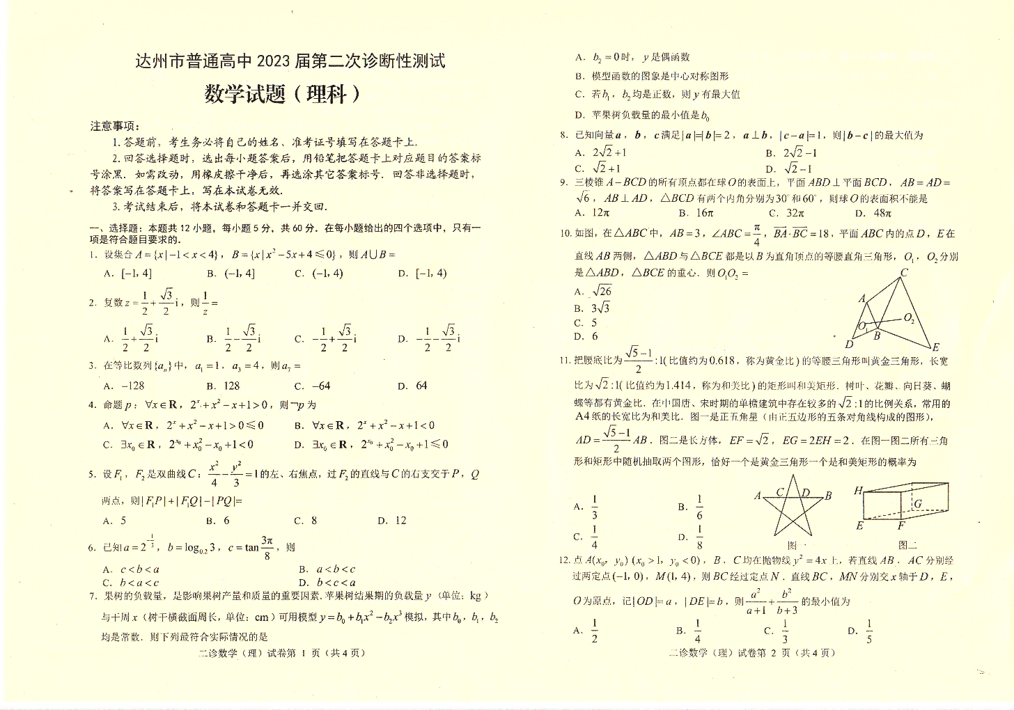 高三理数--四川省达州市2023届高三下学期第二次诊断性测试