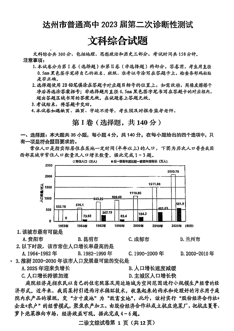 高三文综--四川省达州市2023届高三下学期第二次诊断性测试