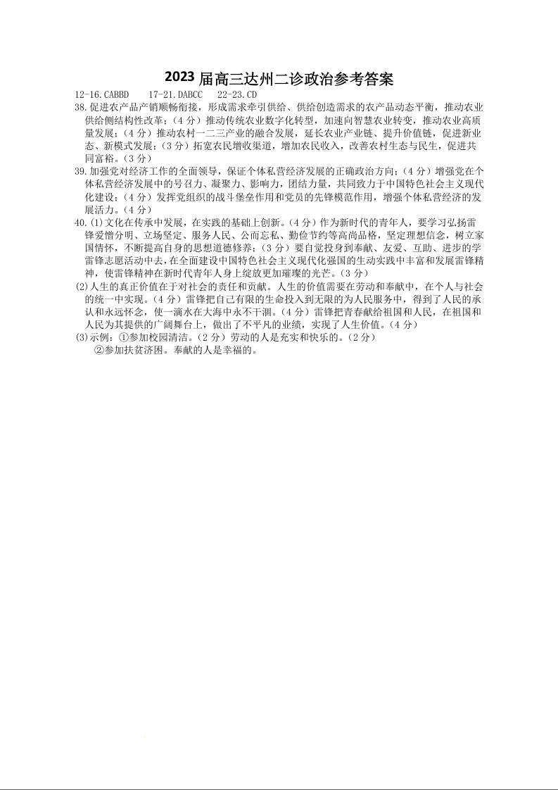 高三文综政治答案--四川省达州市2023届高三下学期第二次诊断性测试