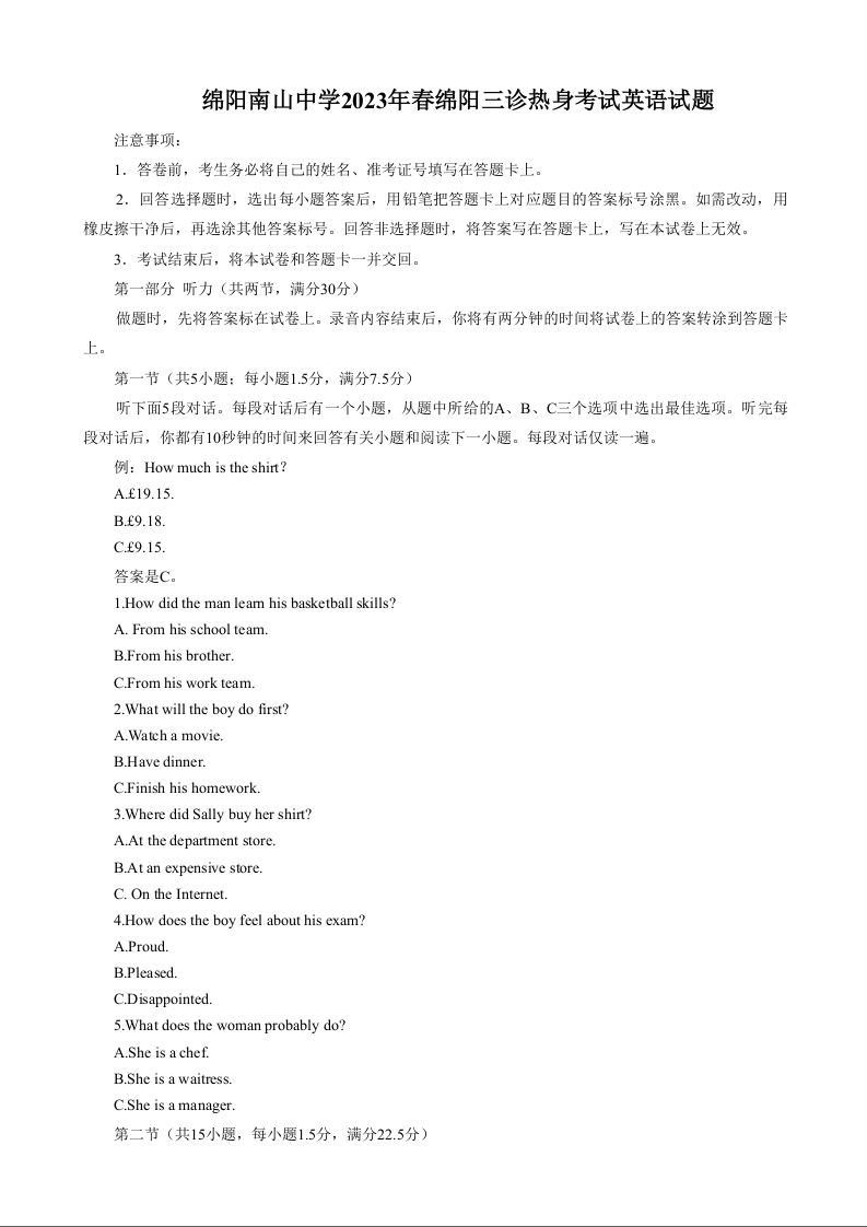 高三英语--四川省绵阳南山中学2023届高三三诊热身考试