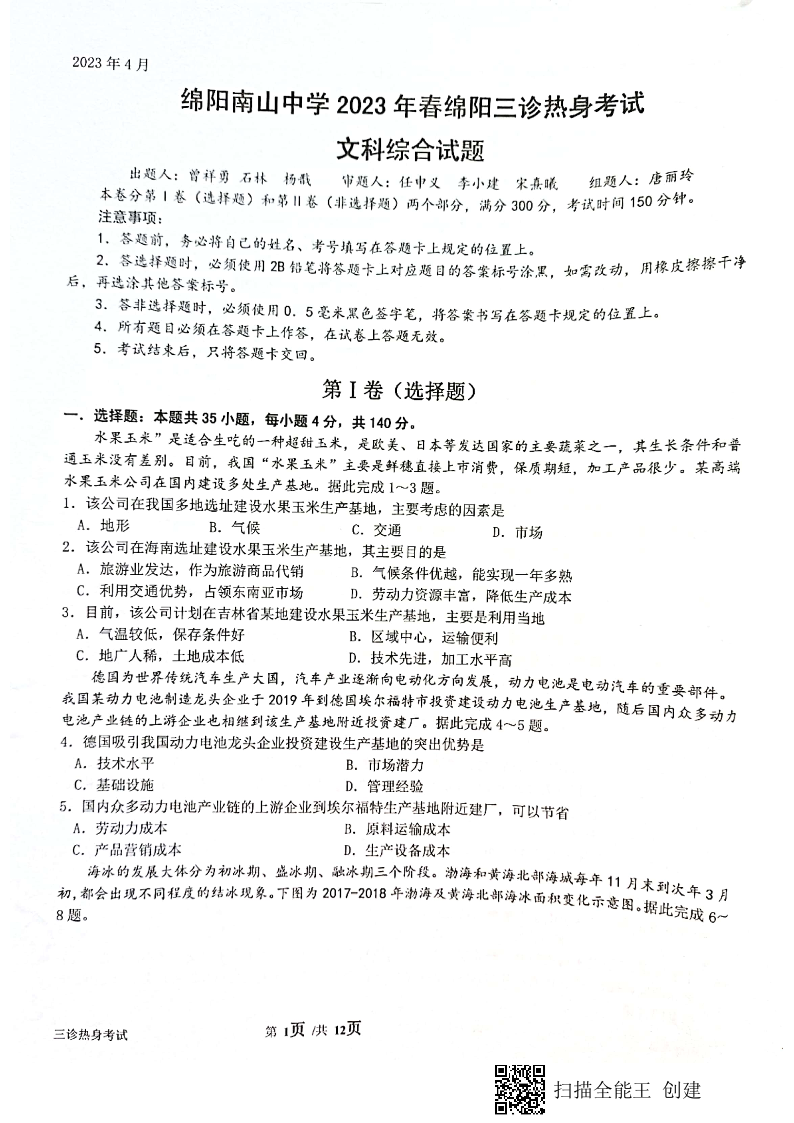 高三文综+答案--四川省绵阳南山中学2023届高三三诊热身考试