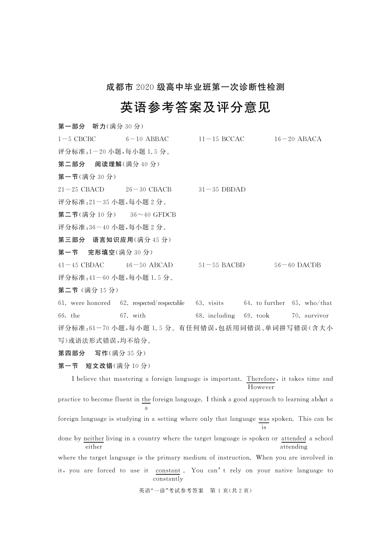 高三英语答案--四川成都市2020级高中毕业班第一次诊断性检测