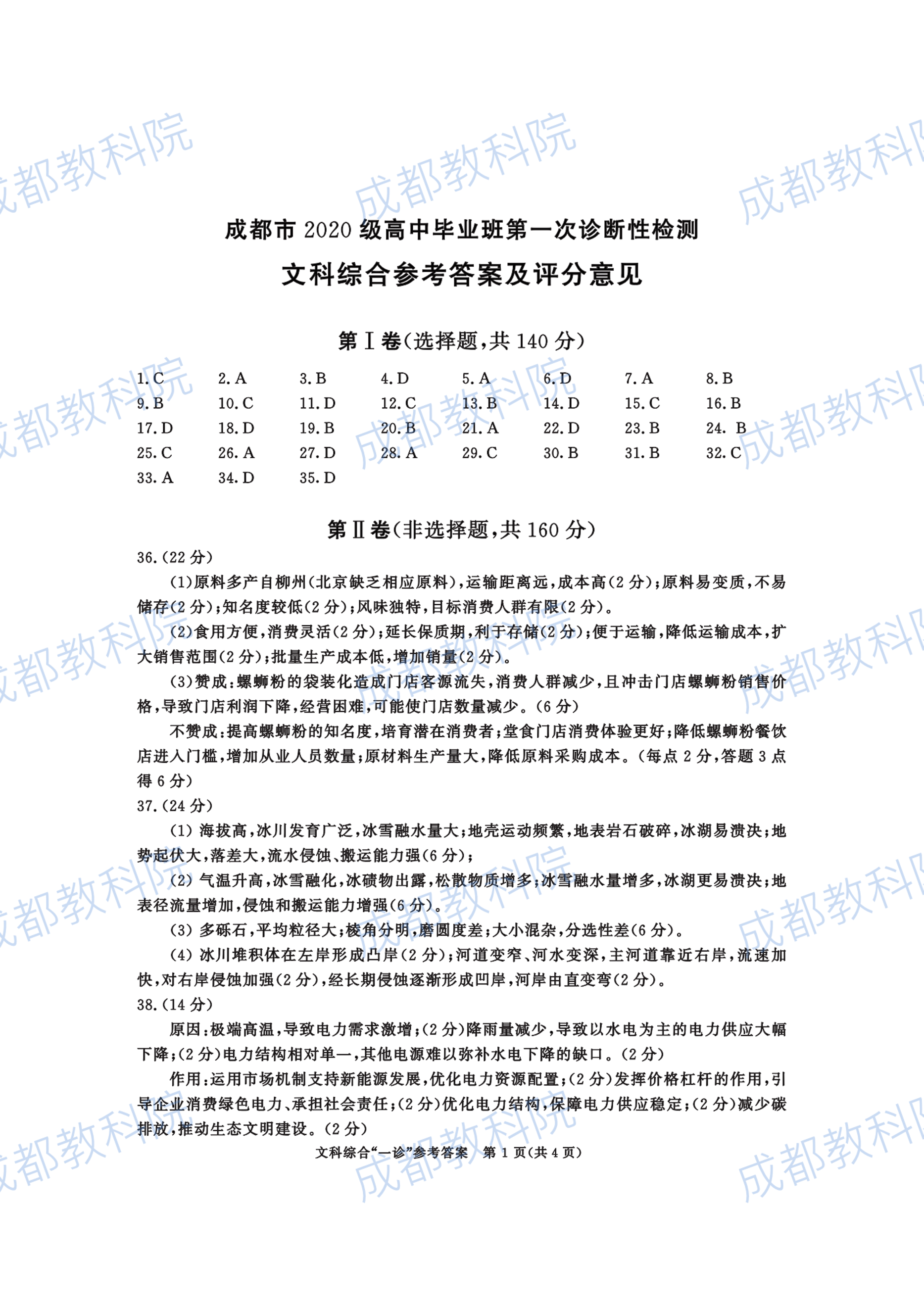 高三文综答案--四川成都市2020级高中毕业班第一次诊断性检测