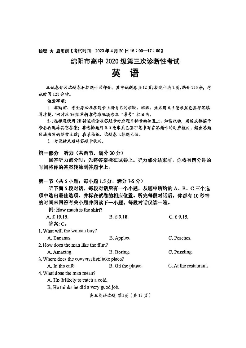 高三英语--四川省绵阳市2023届高三第三次诊断性考试