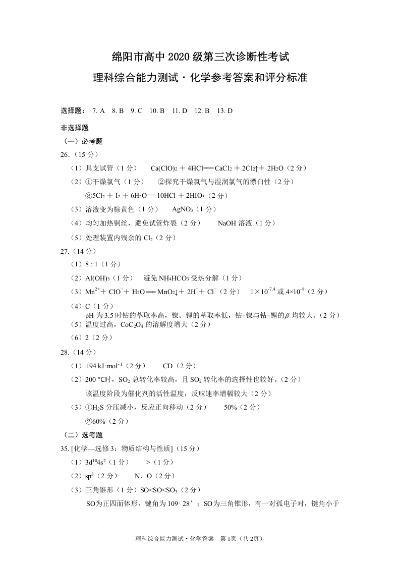 高三理综化学答案--四川省绵阳市2023届高三第三次诊断性考试