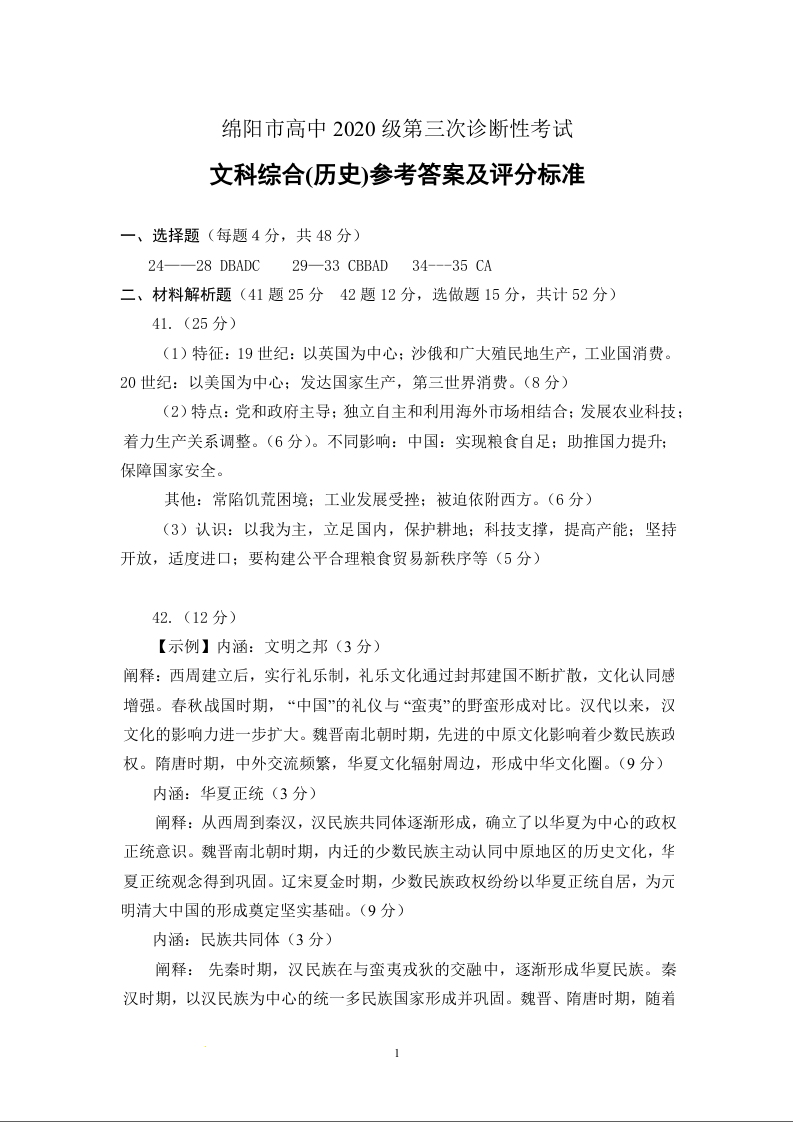 高三文综历史答案--四川省绵阳市2023届高三第三次诊断性考试