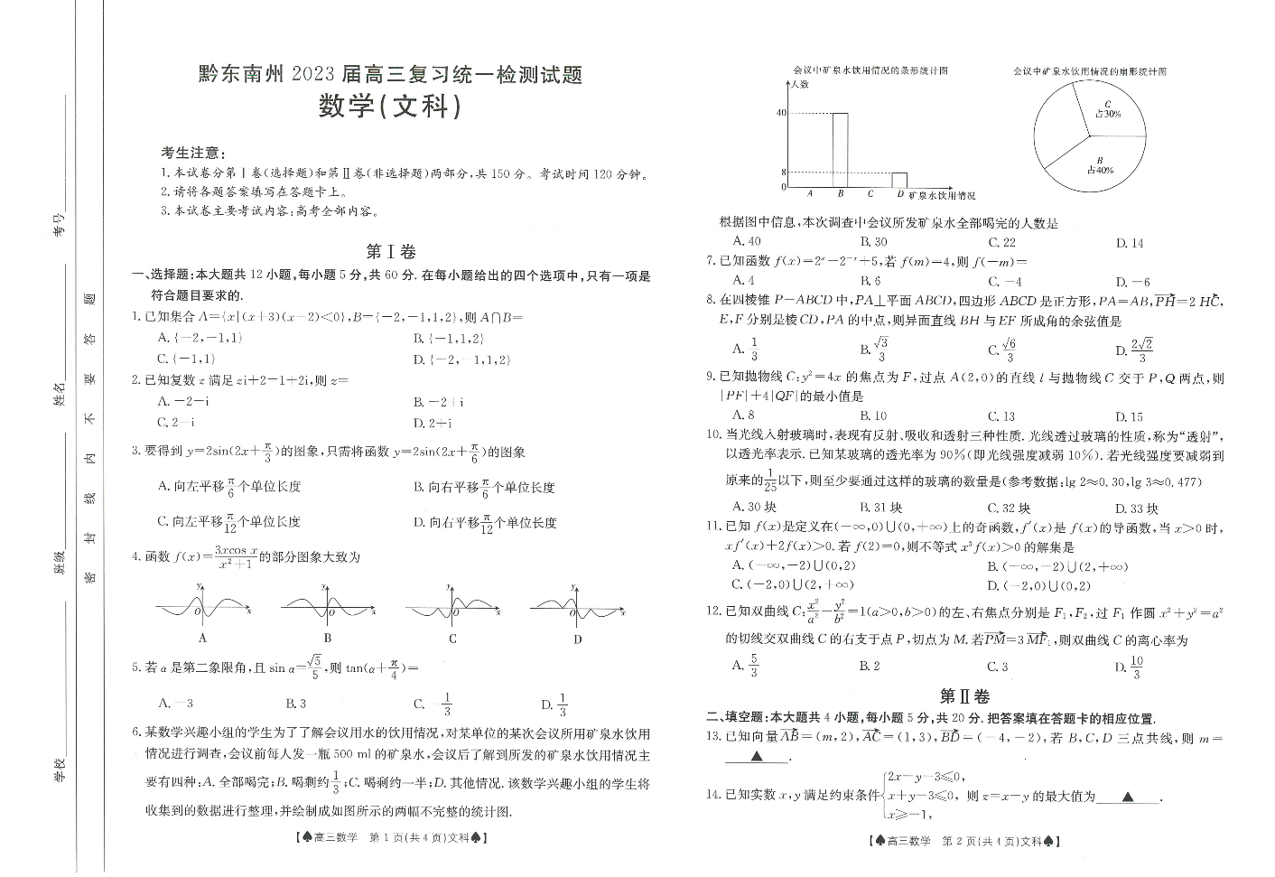 高三文科数学--贵州省黔东南州2023届高三上学期复习统一检测(期末)