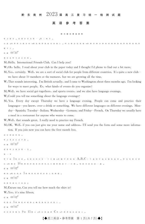 高三英语答案--贵州省黔东南州2023届高三上学期复习统一检测(期末)