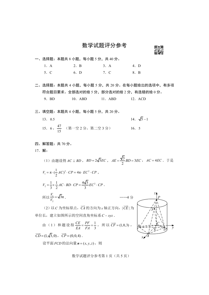 高三数学答案--安徽吉林黑龙江云南四省2023届高三适应性考试