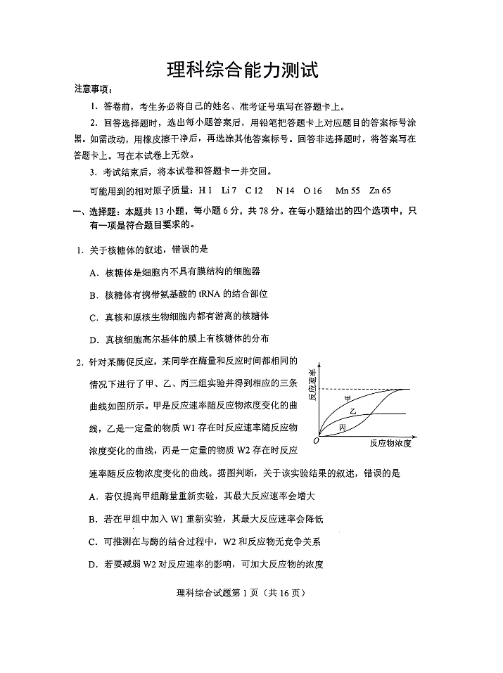 高三理综--安徽吉林黑龙江云南四省2023届高三适应性考试