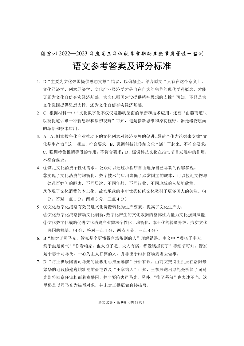 高三语文答案--云南省德宏州2023届高三上学期期末考试