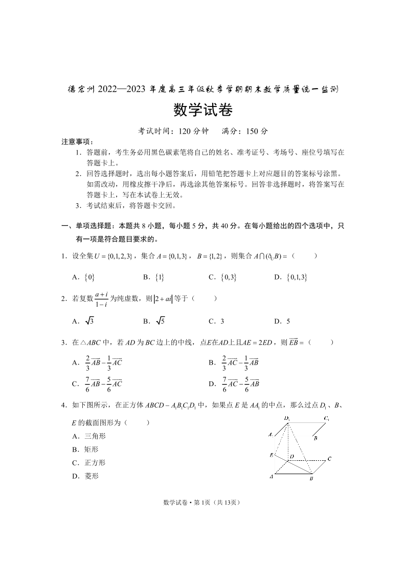 高三数学--云南省德宏州2023届高三上学期期末考试