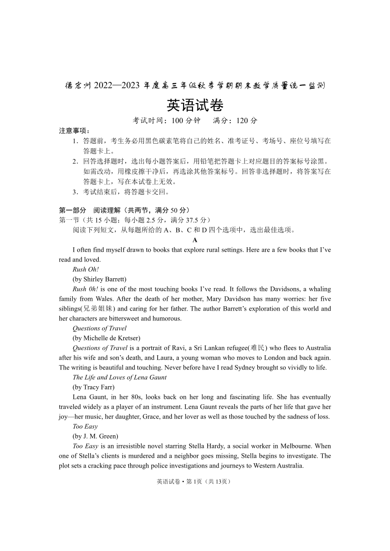 高三英语--云南省德宏州2023届高三上学期期末考试