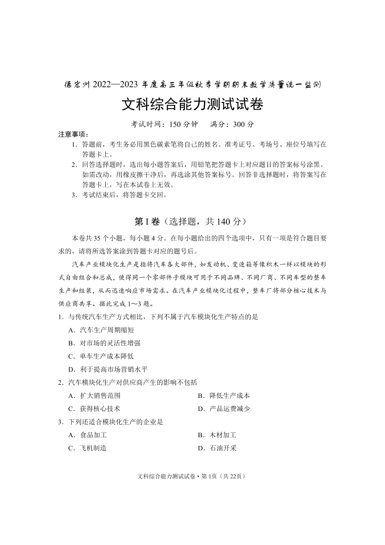 高三文综--云南省德宏州2023届高三上学期期末考试