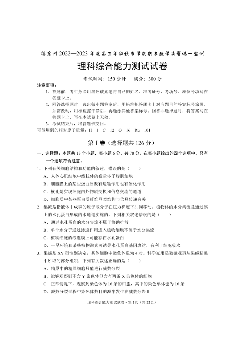 高三理综--云南省德宏州2023届高三上学期期末考试