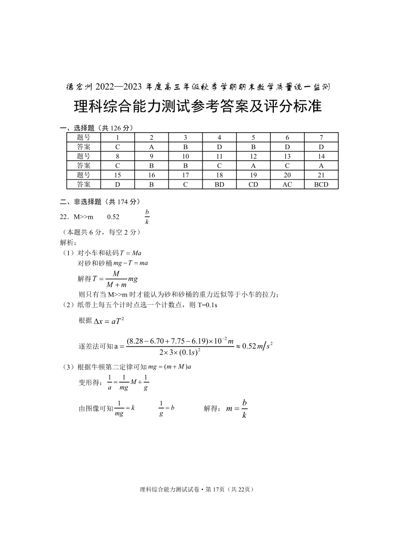 高三理综答案--云南省德宏州2023届高三上学期期末考试