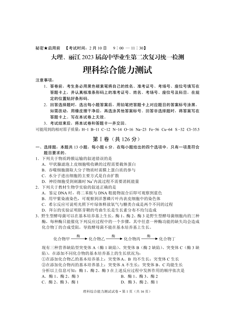 高三理综+答案--云南省大理、丽江、怒江2023届高中毕业生第二次复习统一检测