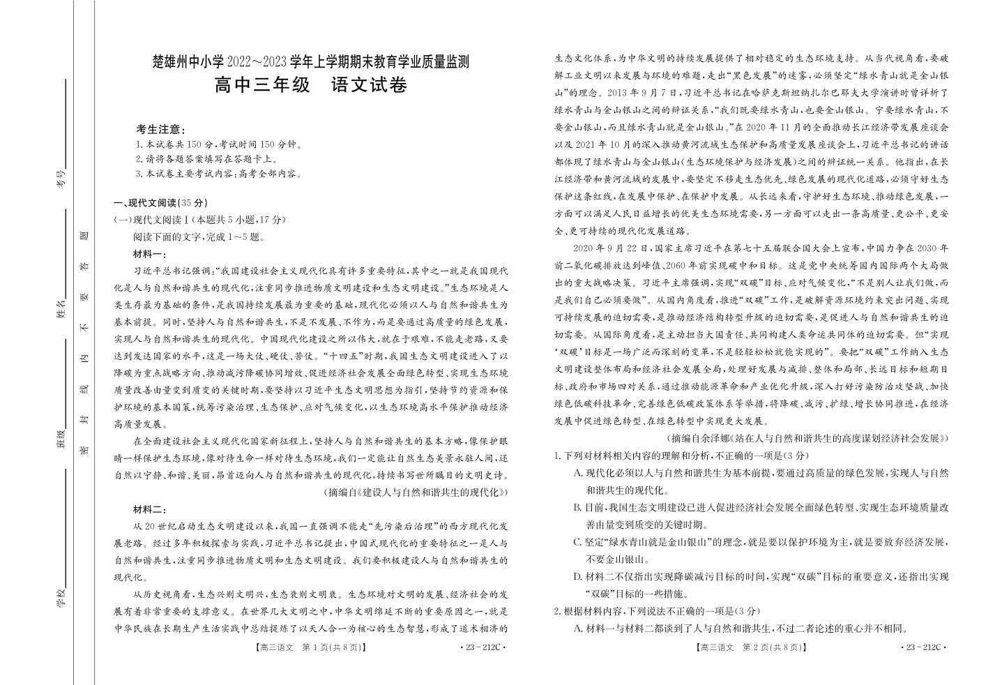 高三语文--云南省楚雄彝族自治州2022-2023学年高三上学期期末教育学业质量监测