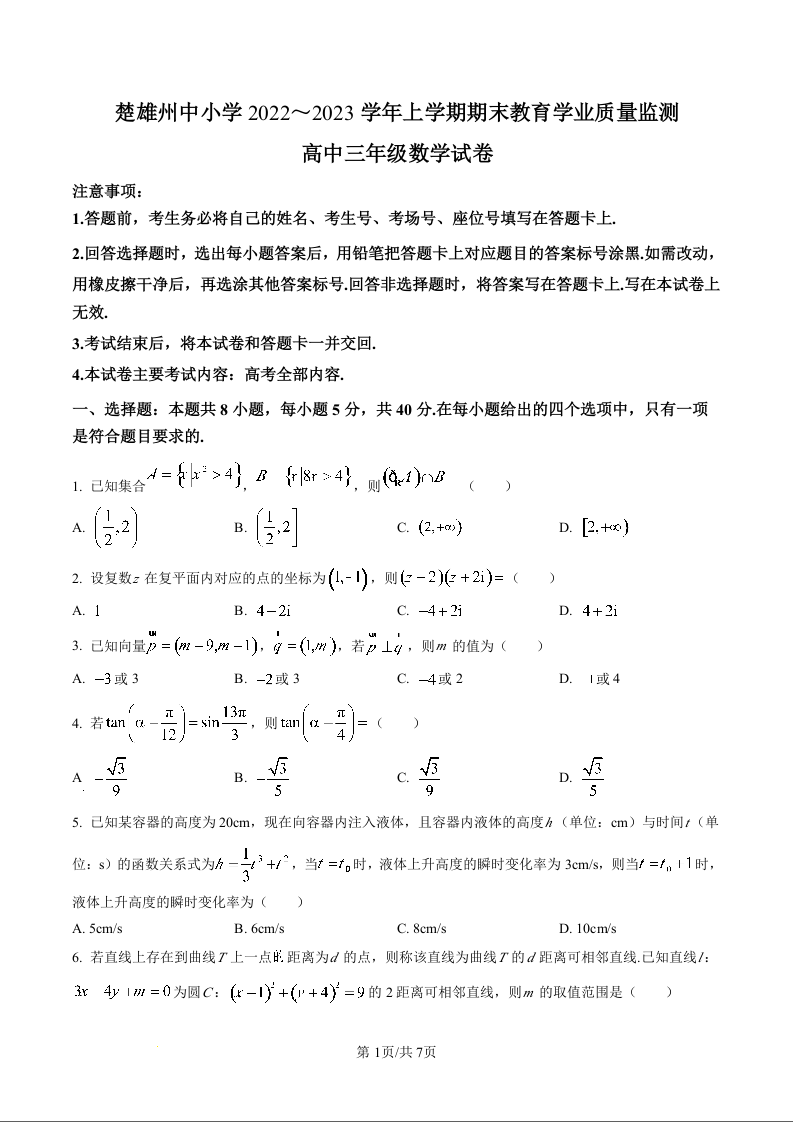 高三数学+答案--云南省楚雄彝族自治州2022-2023学年高三上学期期末教育学业质量监测