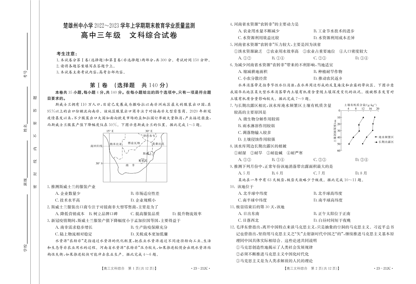 高三文综--云南省楚雄彝族自治州2022-2023学年高三上学期期末教育学业质量监测