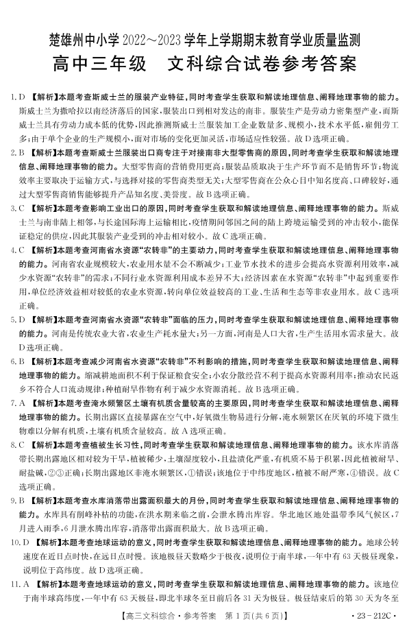 高三文综答案--云南省楚雄彝族自治州2022-2023学年高三上学期期末教育学业质量监测