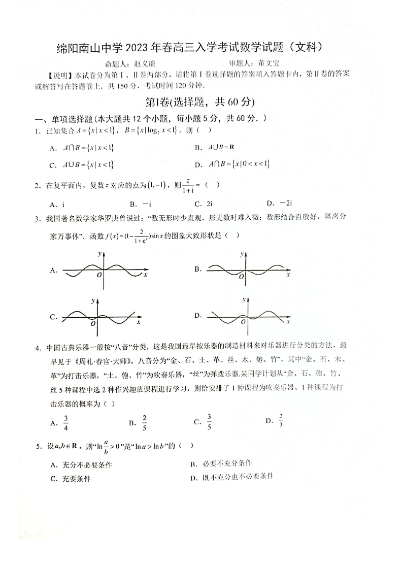 高三文数--四川省绵阳南山中学2022-2023学年高三下学期开学考试