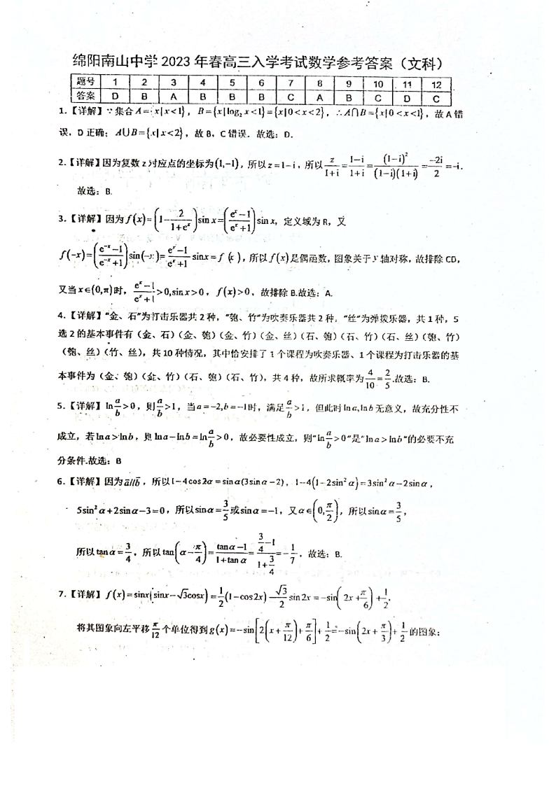 高三文数答案--四川省绵阳南山中学2022-2023学年高三下学期开学考试
