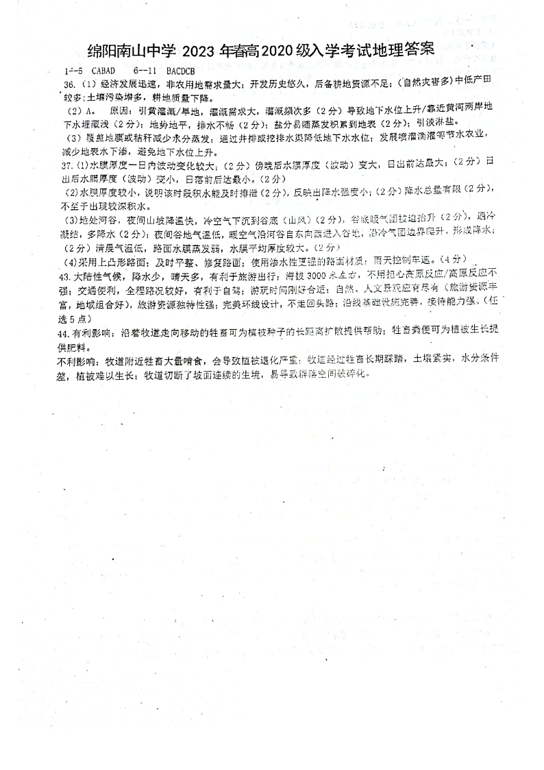 高三文综答案--四川省绵阳南山中学2022-2023学年高三下学期开学考试