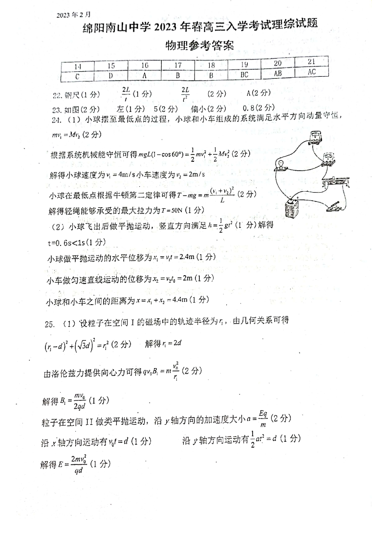 高三理综答案--四川省绵阳南山中学2022-2023学年高三下学期开学考试
