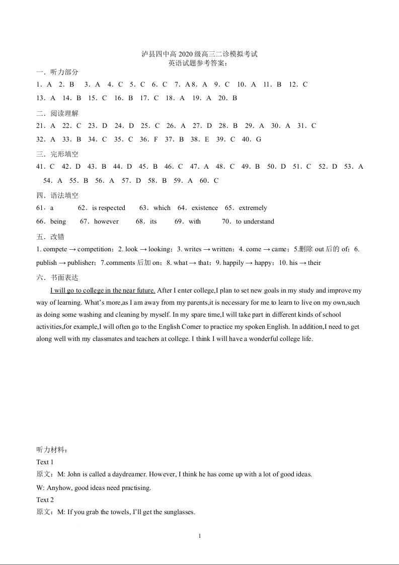 高三英语答案--四川省泸州市2022-2023学年泸县第四中学高三二诊模拟考试