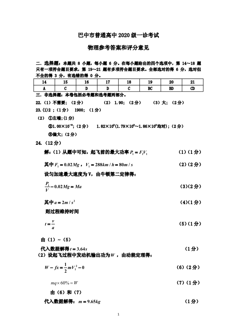 高三理综物理答案--四川省巴中市2023届高三一诊考试