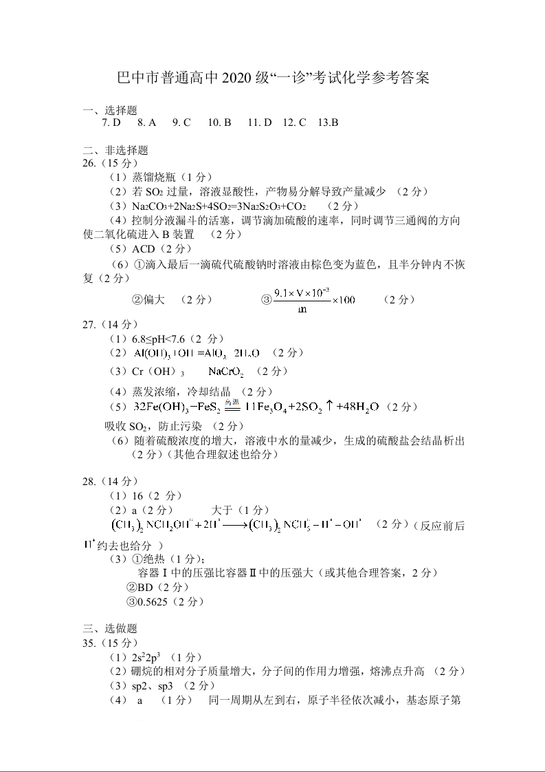 高三理综化学答案--四川省巴中市2023届高三一诊考试