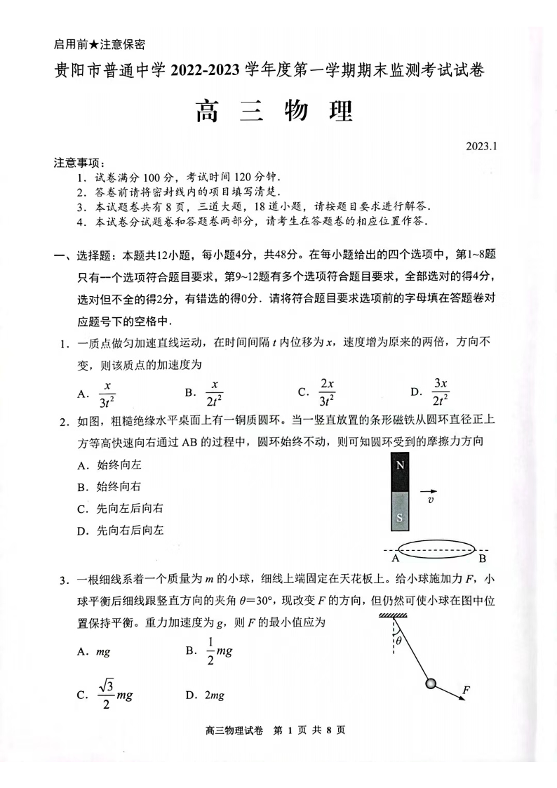 高三物理--贵州省贵阳市普通中学2022-2023学年高三上学期期末监测考试