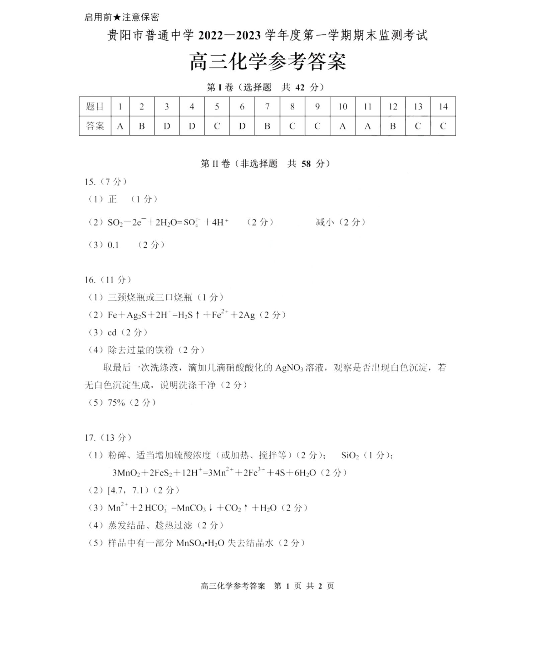 高三化学答案--贵州省贵阳市普通中学2022-2023学年高三上学期期末监测考试