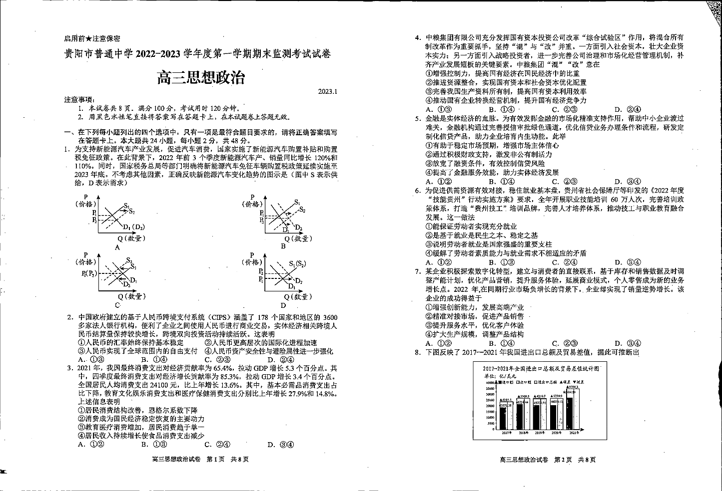 高三政治--贵州省贵阳市普通中学2022-2023学年高三上学期期末监测考试