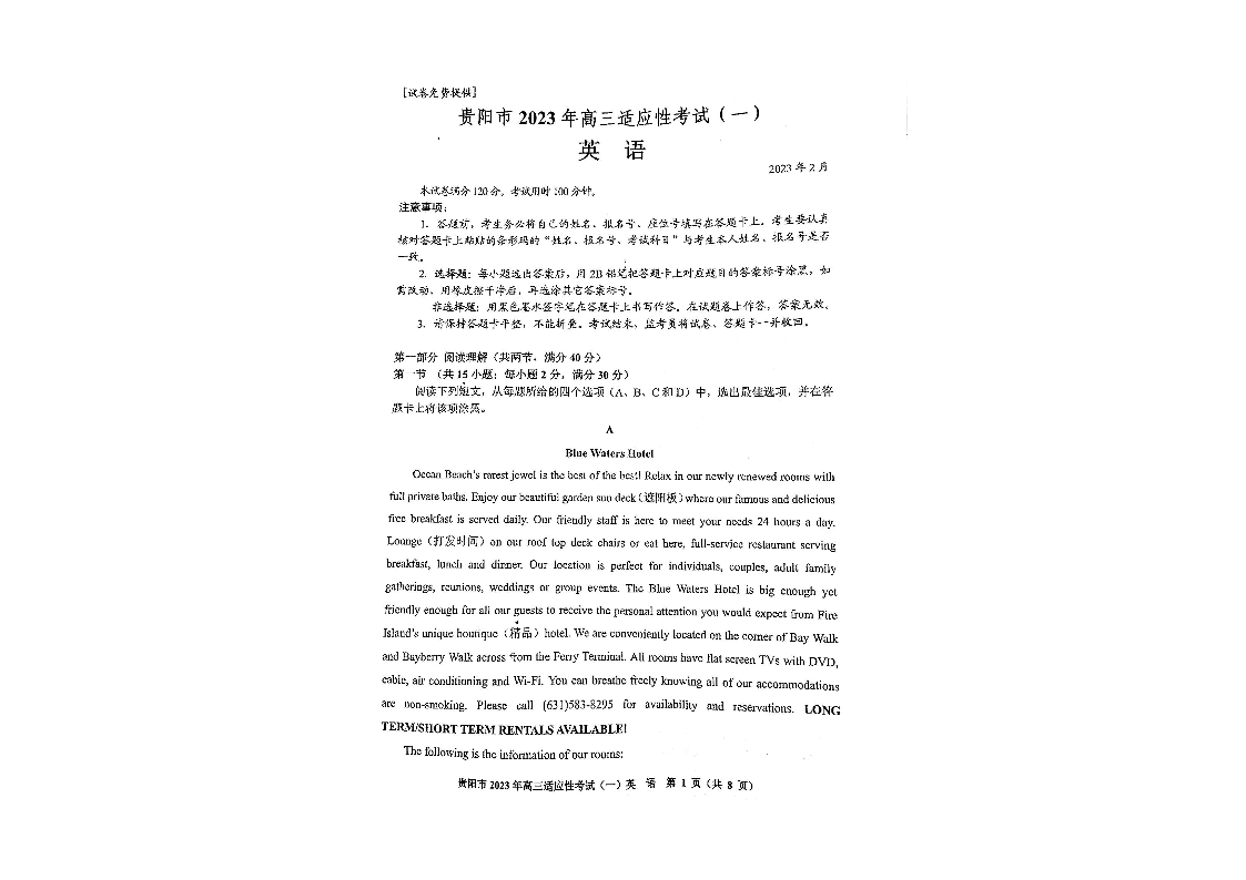 高三英语--贵州省贵阳市2023届高三下学期适应性考试(一)