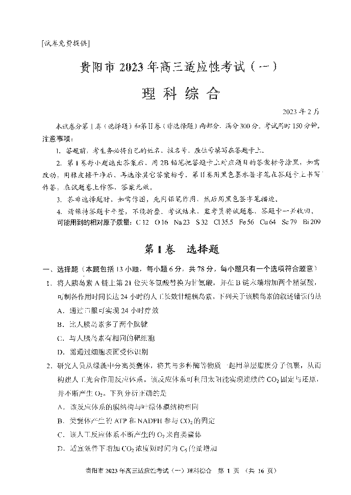 高三理科综合--贵州省贵阳市2023届高三下学期适应性考试(一)