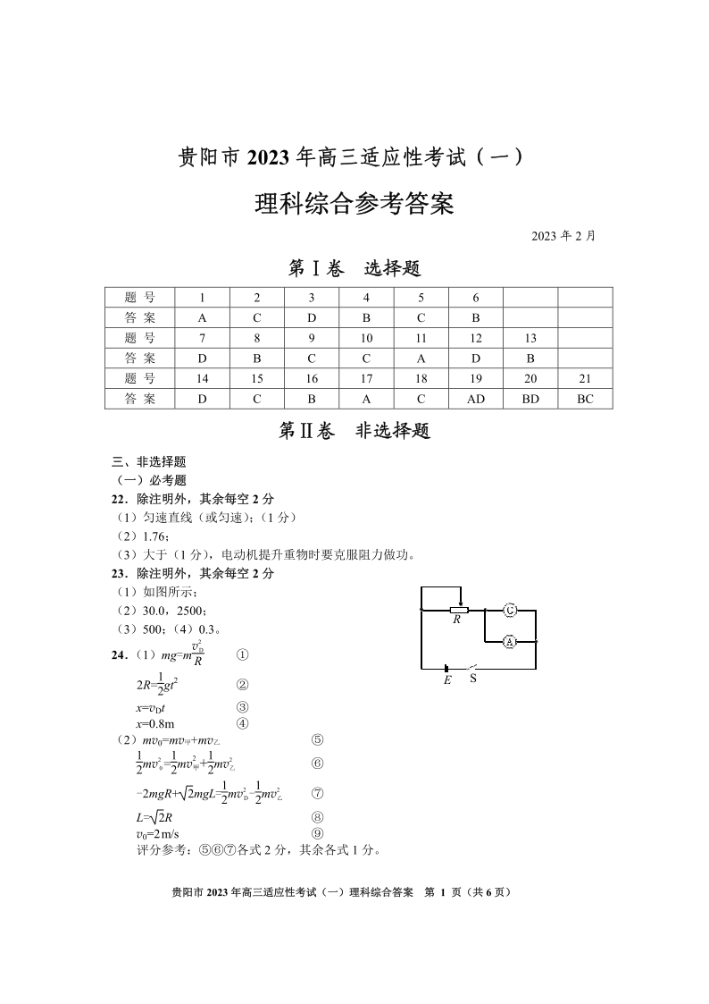 高三理科综合答案--贵州省贵阳市2023届高三下学期适应性考试(一)