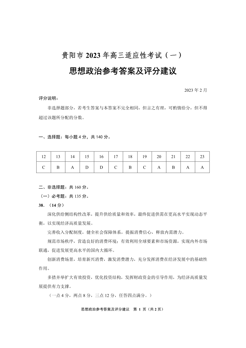 高三文综政治答案--贵州省贵阳市2023届高三下学期适应性考试(一)