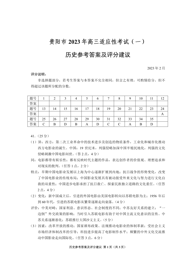 高三文综历史答案--贵州省贵阳市2023届高三下学期适应性考试(一)
