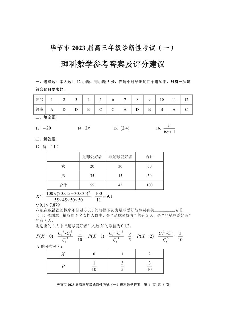 高三理科数学答案--贵州省毕节市2023届高三年级诊断性考试(一)