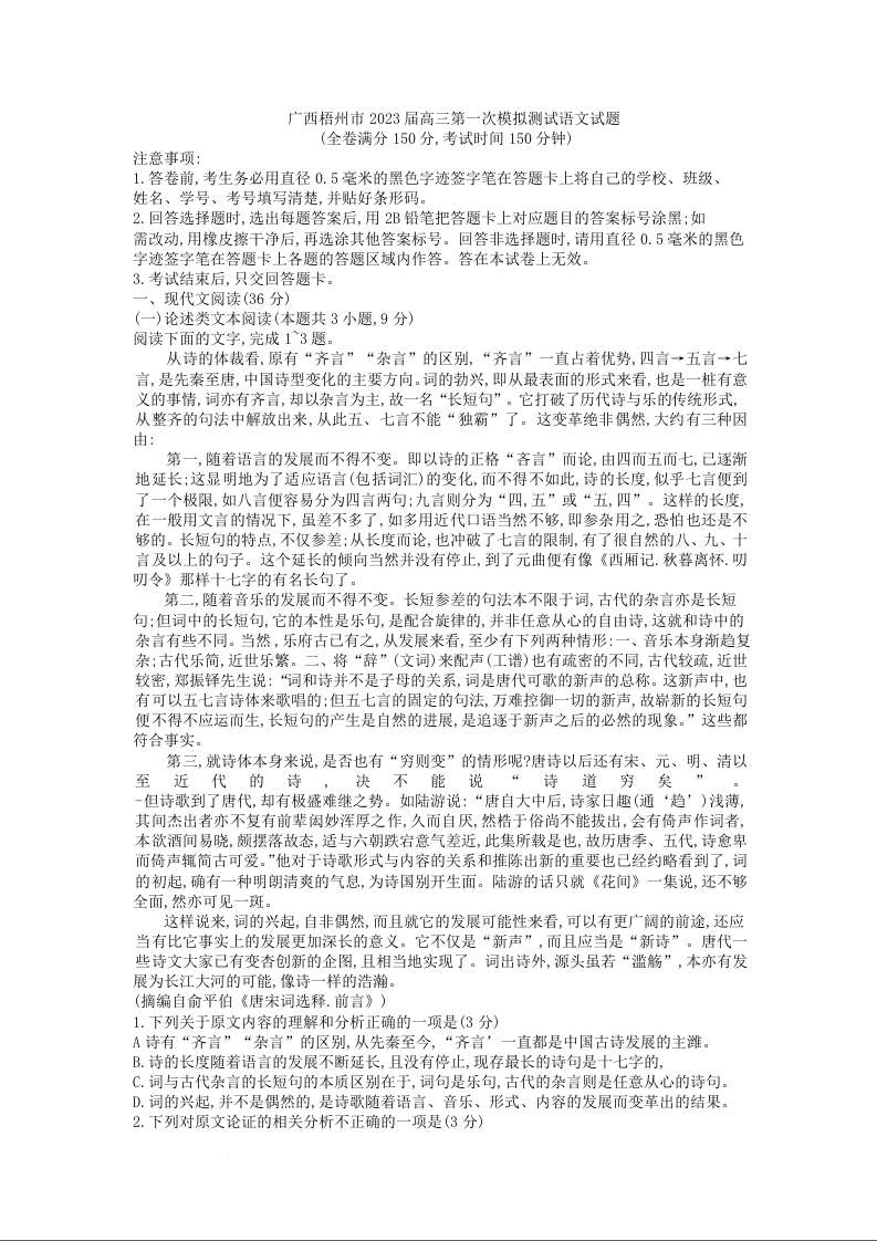 高三语文+答案--广西梧州市2023届高三第一次模拟测