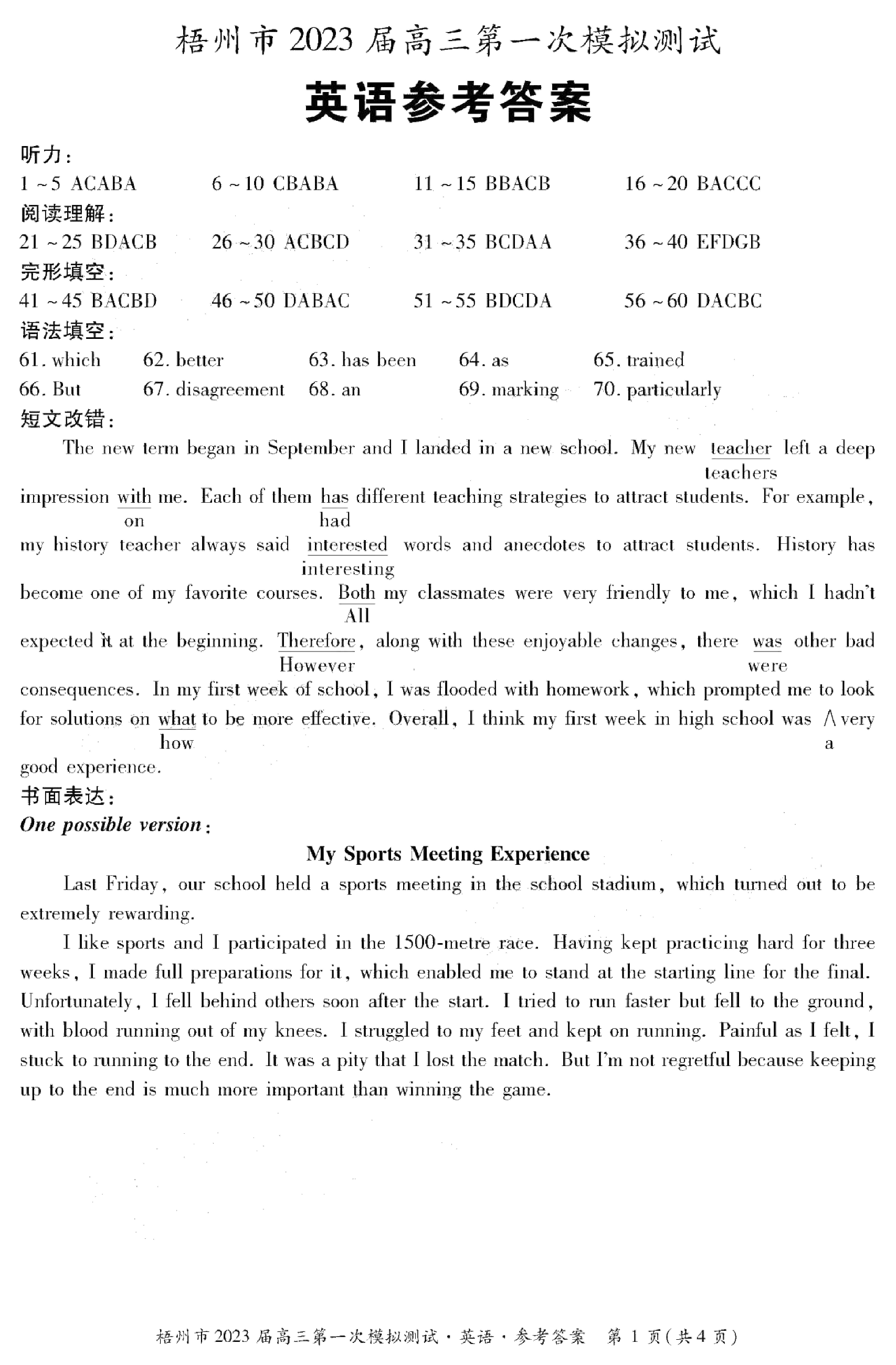 高三英语答案--广西梧州市2023届高三第一次模拟测