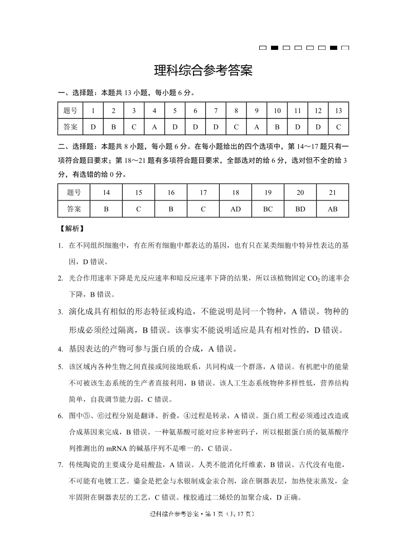 高三理综答案--云南师大附中2023届高考适应性月考卷(七)