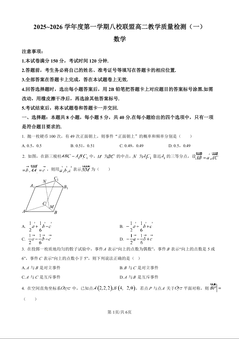 高二数学(原卷版)--广东省八校联盟2025-2026学年高二上学期教学质量检测(一)
