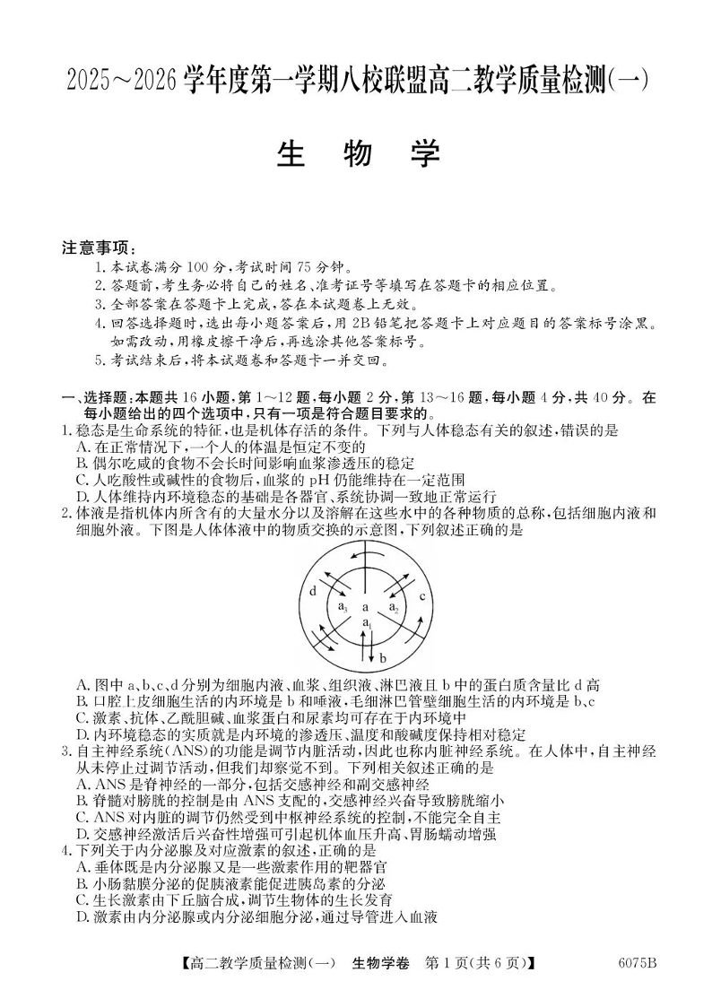 高二生物+答案--广东省八校联盟2025-2026学年高二上学期教学质量检测(一)