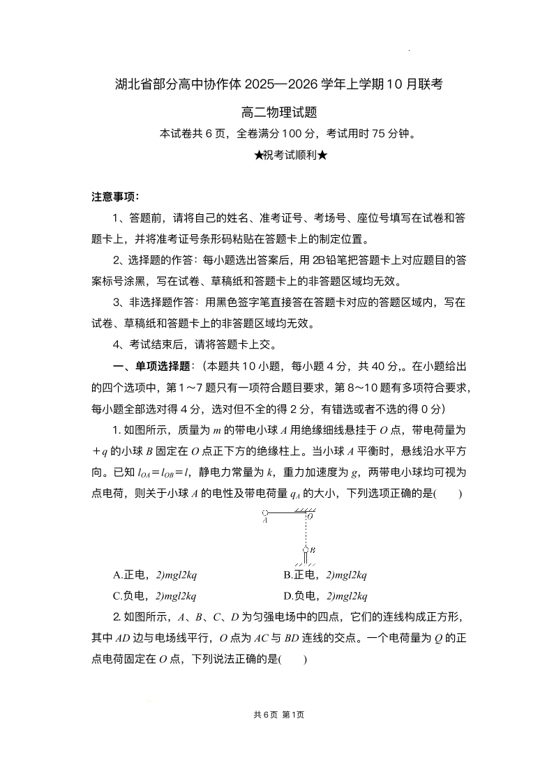 高二物理+答案--湖北省部分高中协作体2025-2026学年高二上学期10月月考