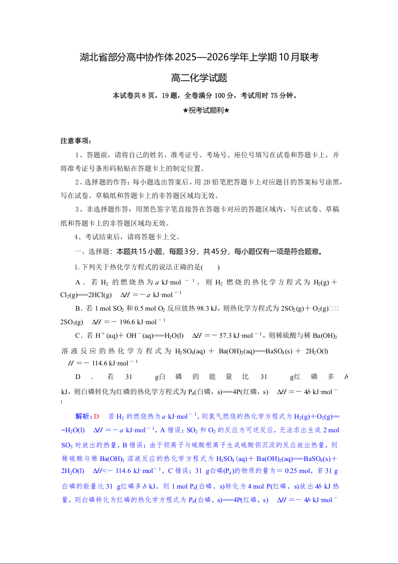 高二化学(解析版)--湖北省部分高中协作体2025-2026学年高二上学期10月月考