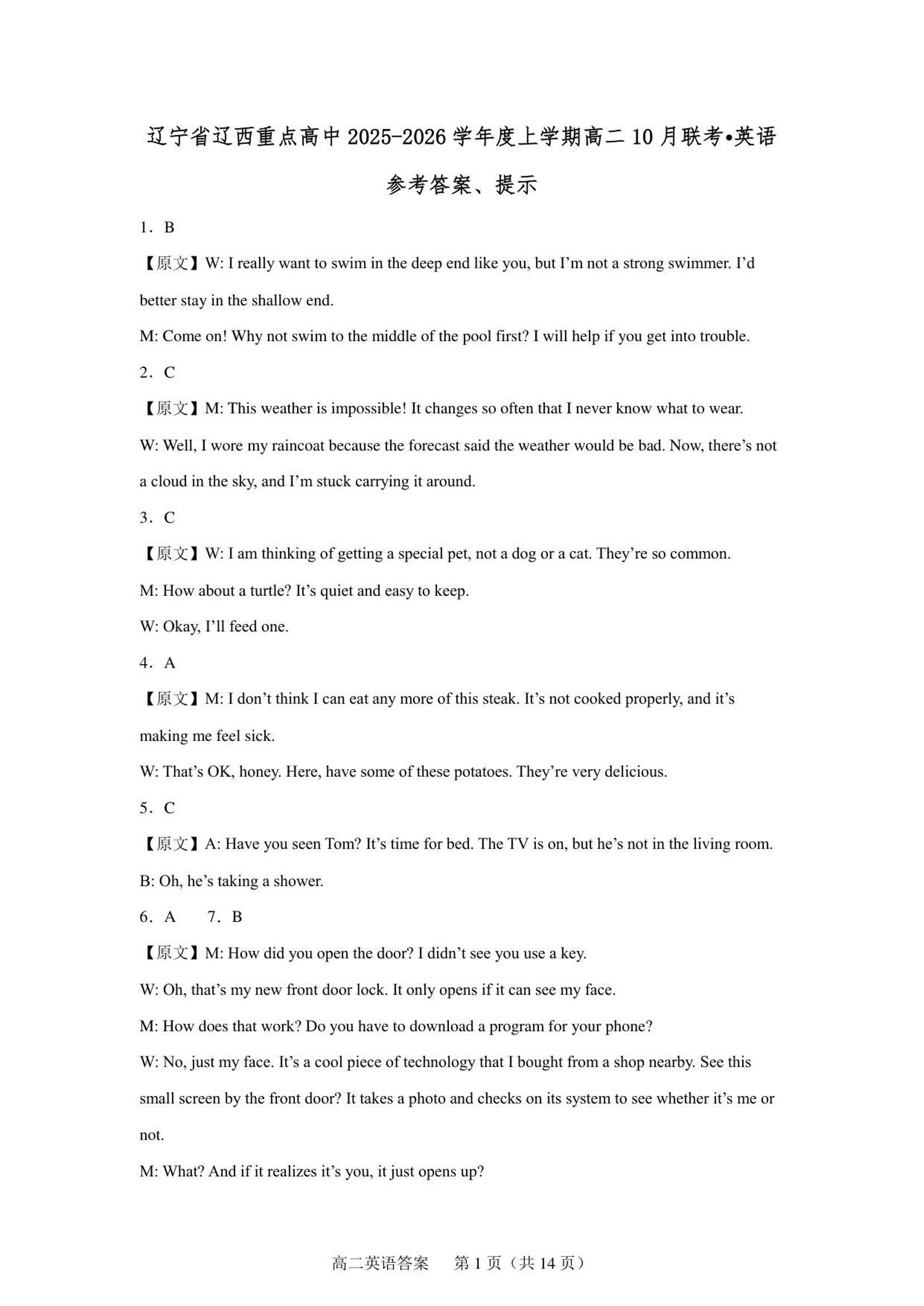 高二英语答案--辽西重点高中2025-2026学年高二上学期10月月考