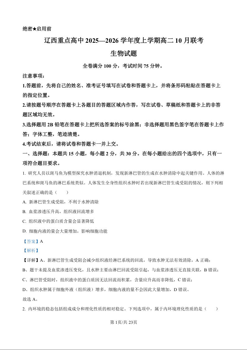 高二生物(精品解析版)--辽西重点高中2025-2026学年高二上学期10月月考